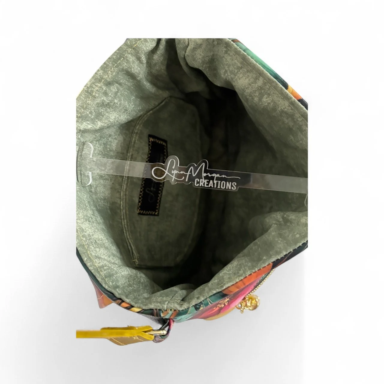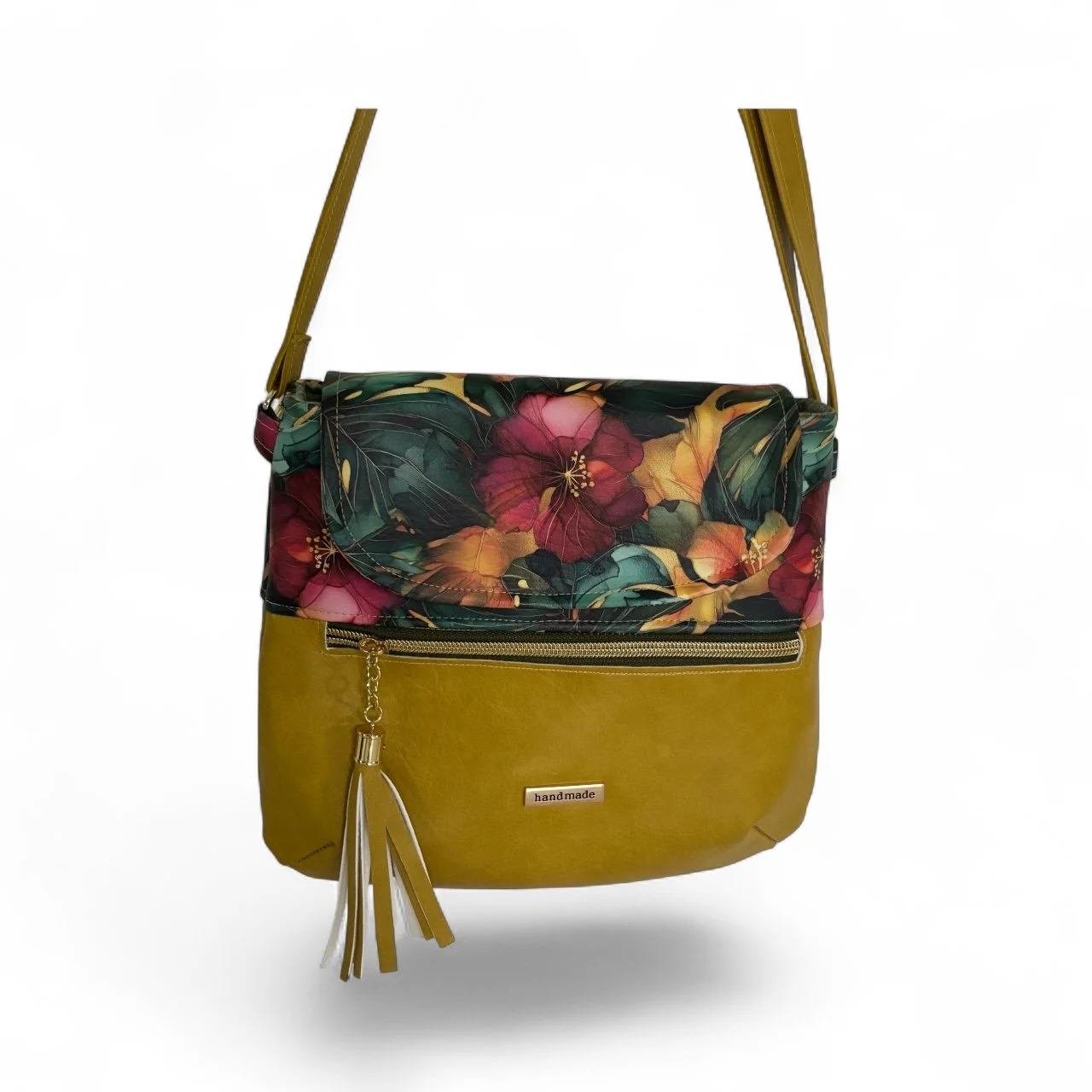 The perfect size cross-body bag, Ginger has a front zipper pocket, a magnetic snap closure and an inside slip pocket. This bag is made from faux leather in a mustard yellow and a tropical floral print with gold hardware and an adjustable strap.