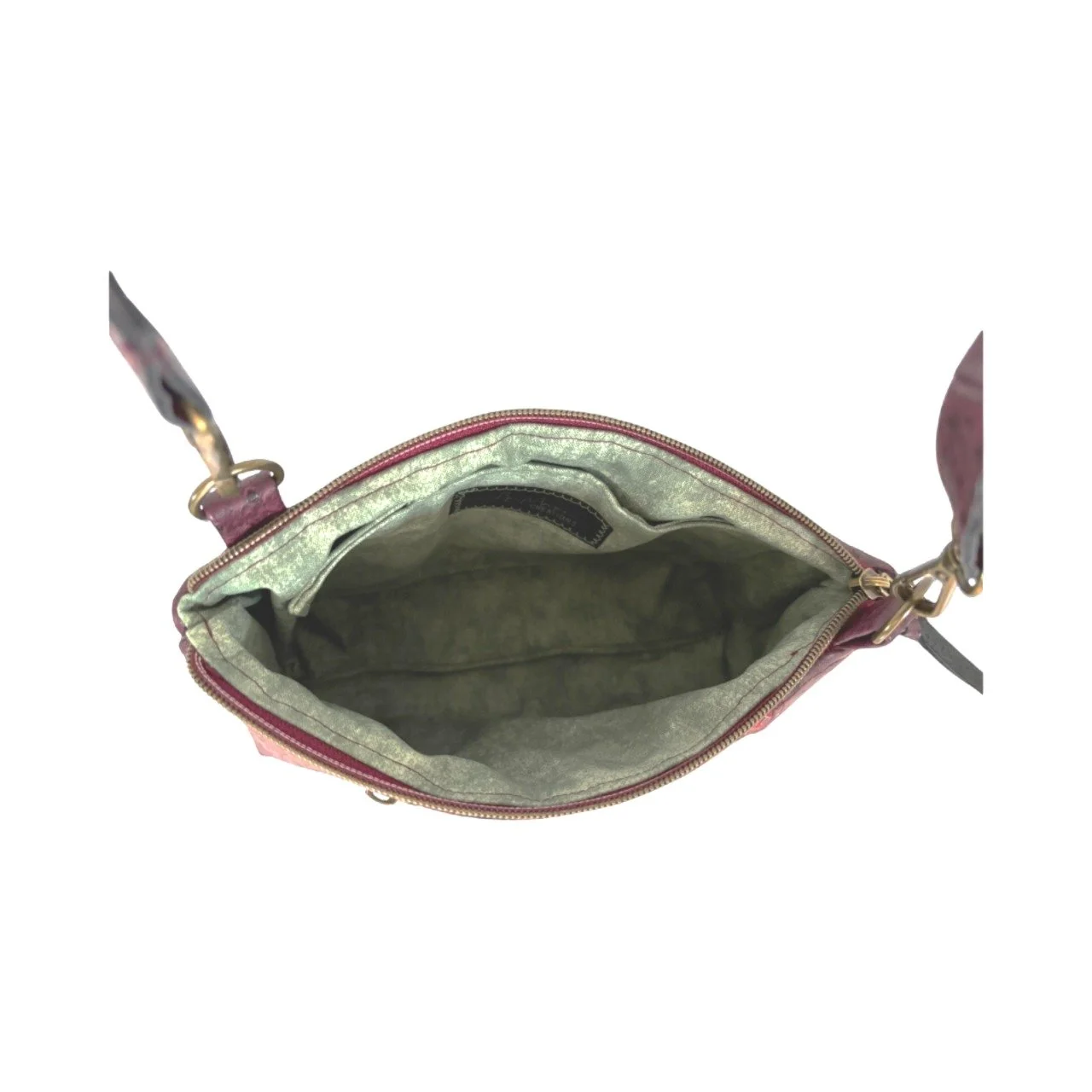 This classy crossbody bag is just big enough to hold all the essentials, and it’s so stylish! It has an adjustable strap, an outside zipper pocket and an inside slip pocket. Made of merlot faux ostrich and a beautiful Japanese lantern print cotton with a cotton interior.